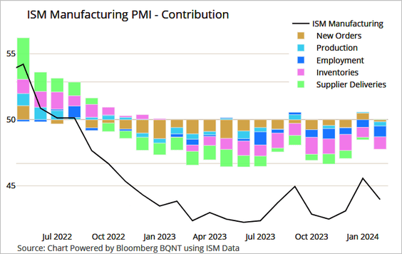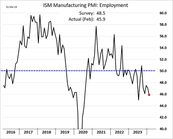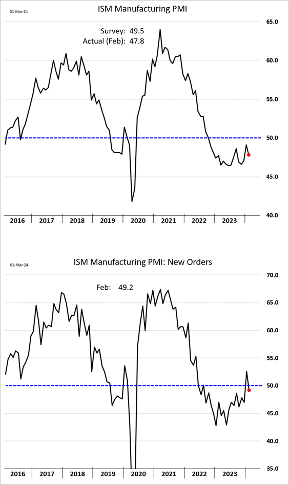 9) The ISM manufacturing PMI unexpectedly moved deeper into contraction territory last month: