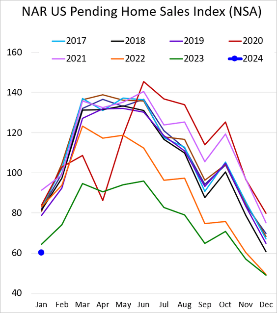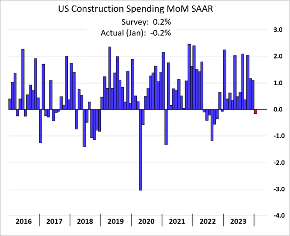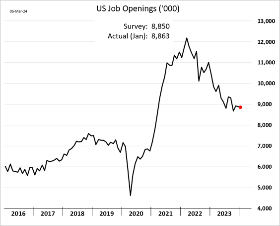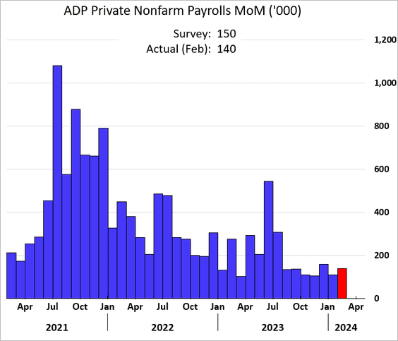 4) The ADP private payrolls estimate showed 140k jobs created in February, which was slightly below expectations: