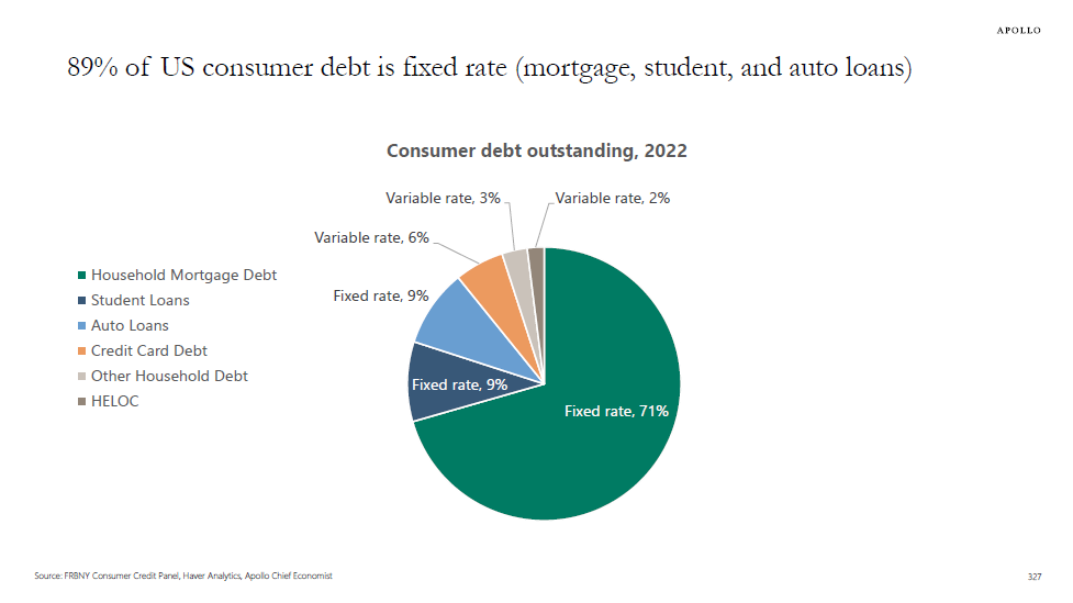 3) 89% of US household debt is fixed rate (mortgage, student, and auto loans) and 11% is floating rate (credit cards, HELOC, and other types of debt):
