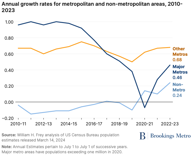3) There’s a noticeable difference in how the population is growing in metropolitan (big cities and their surrounding areas) and non-metropolitan (smaller towns and rural areas) regions.