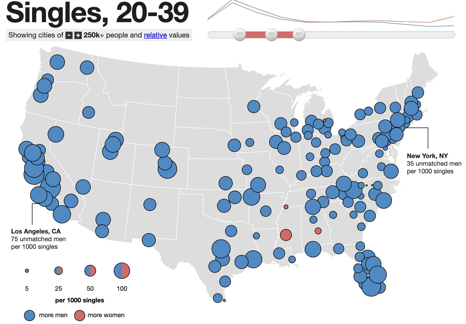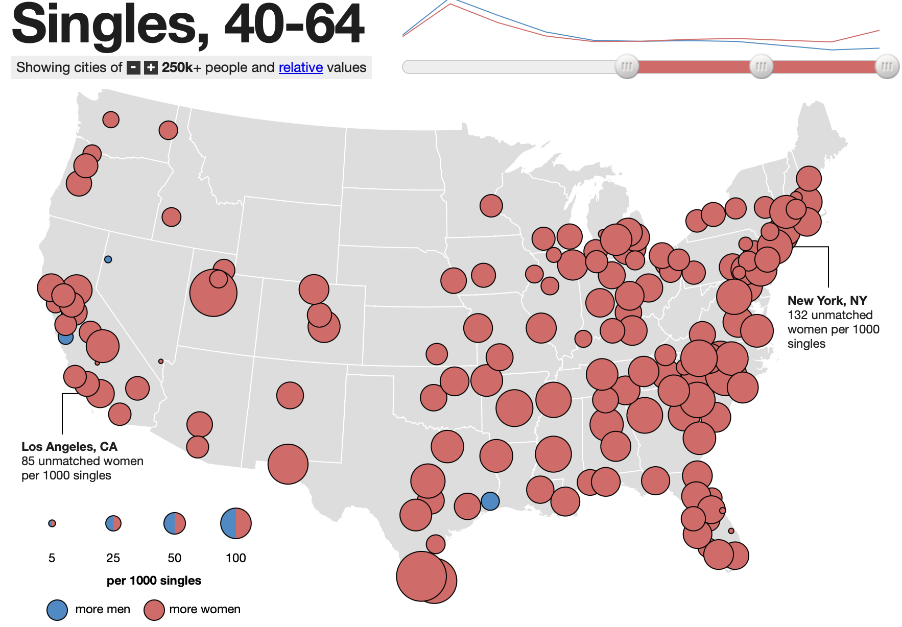 12) What a difference age makes (Single male to female ratio ages 20-39 vs 40-64):