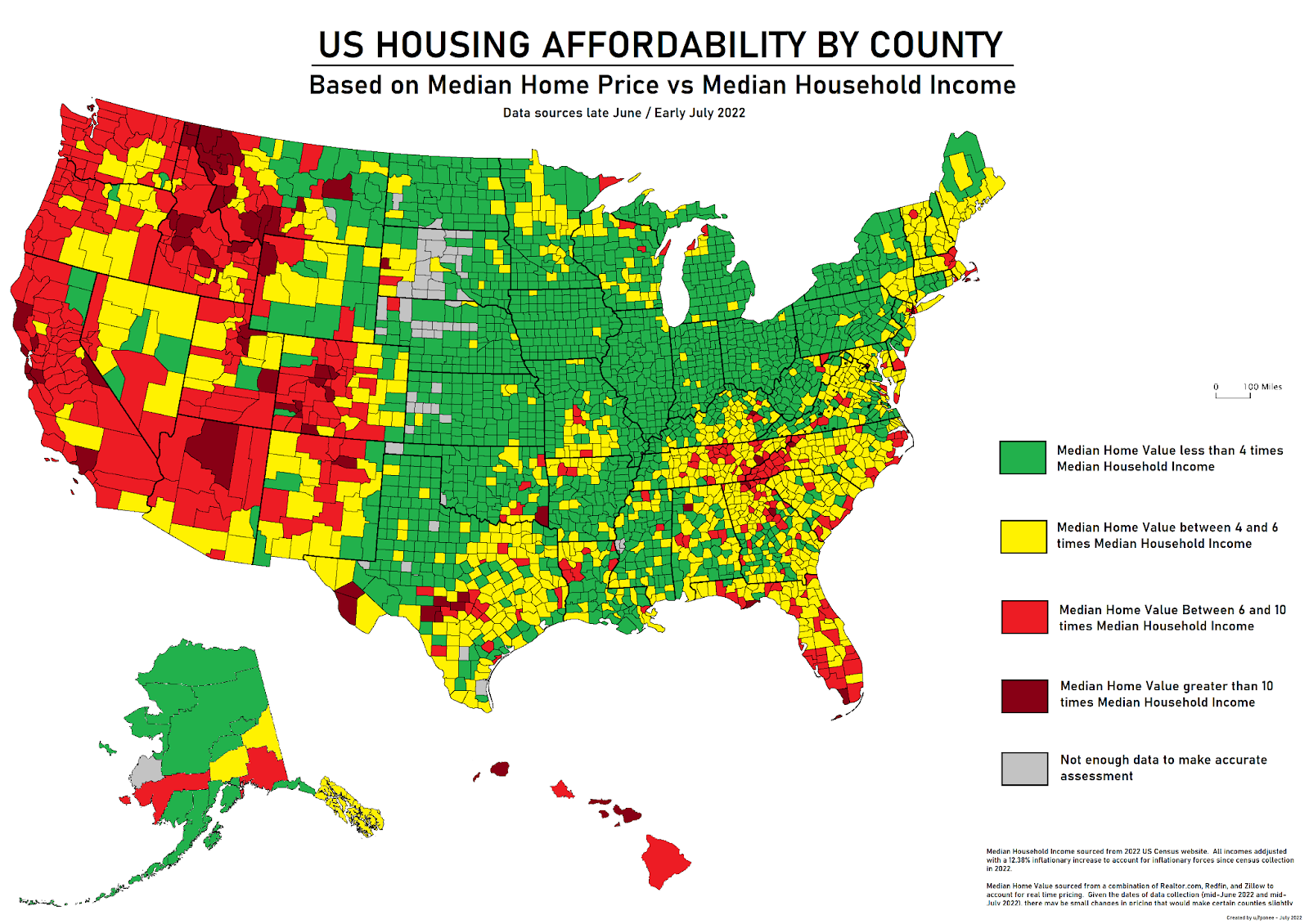 In counties with low population but a lot of scenic beauty, median income is probably low but median housing costs are probably high due to the presence of expensive vacation homes.