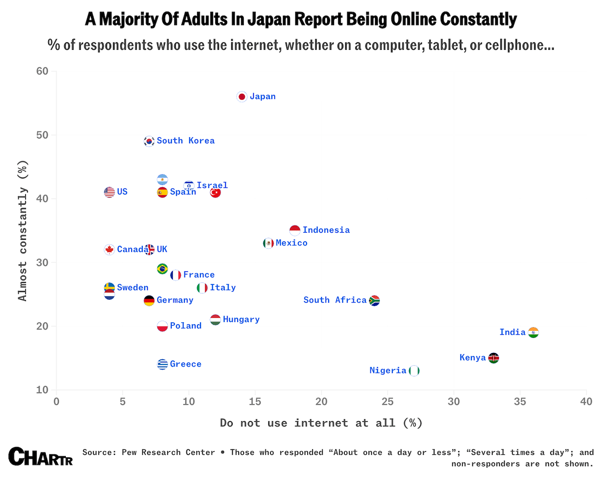 12) In 1997, only 2% of people had used the internet. Today, 28% of adults are constantly online: