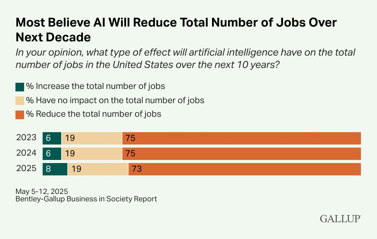 14) The majority (73%) of Americans believe AI will reduce the total number of jobs in the United States over the next 10 years.