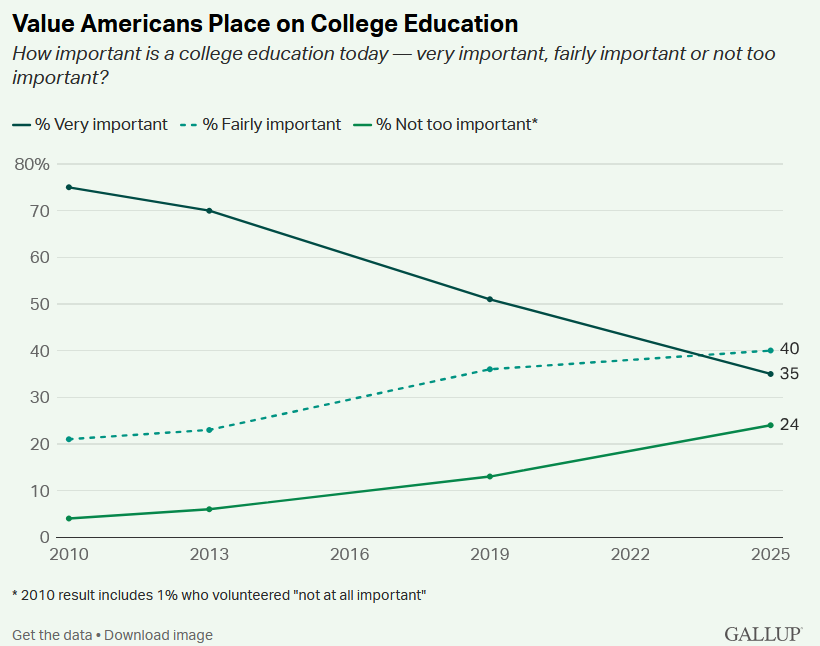 8) The percentage of Americans saying college is "very important" has fallen to 35%: