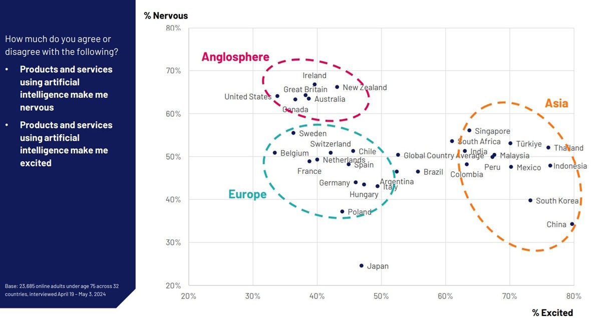 And in international comparisons, the U.S. stands out as almost uniquely apprehensive about AI: