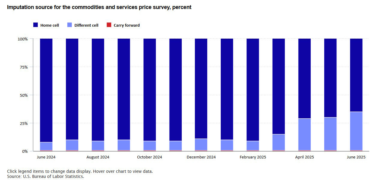 10) The percent of prices that the BLS has to "impute" (basically, guess from other prices) has risen from 9% before Trump took office to 35% now: