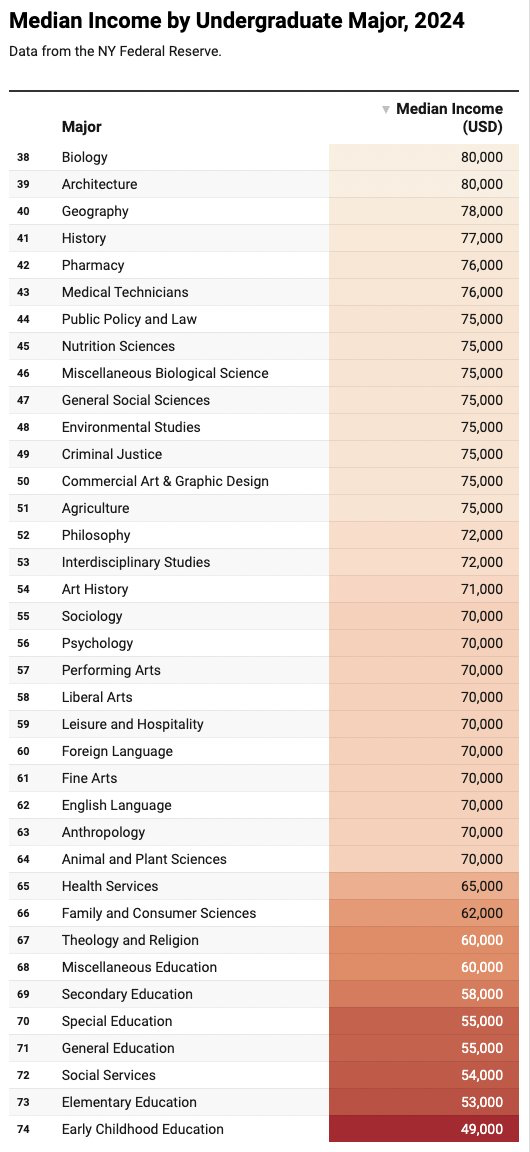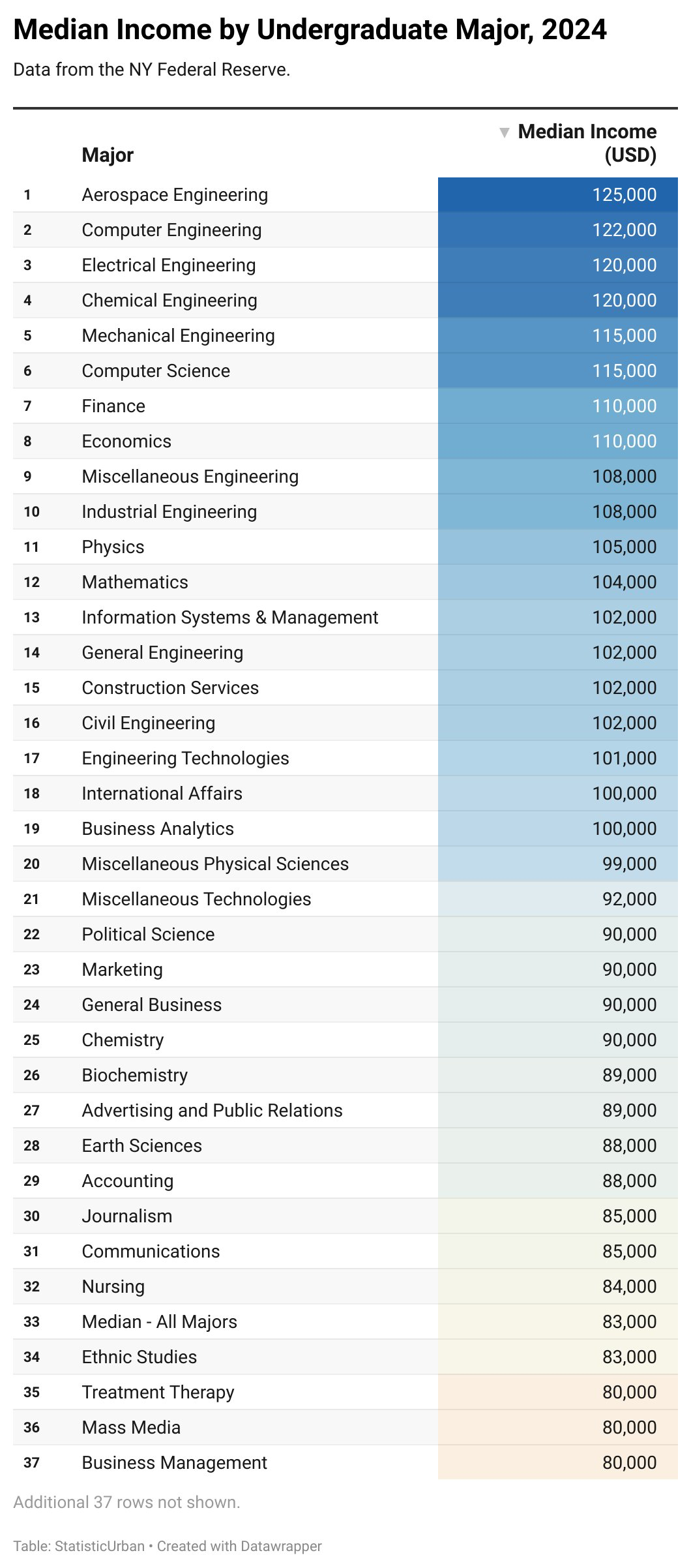 20) Here's the median income of 74 undergraduate majors for 2024: