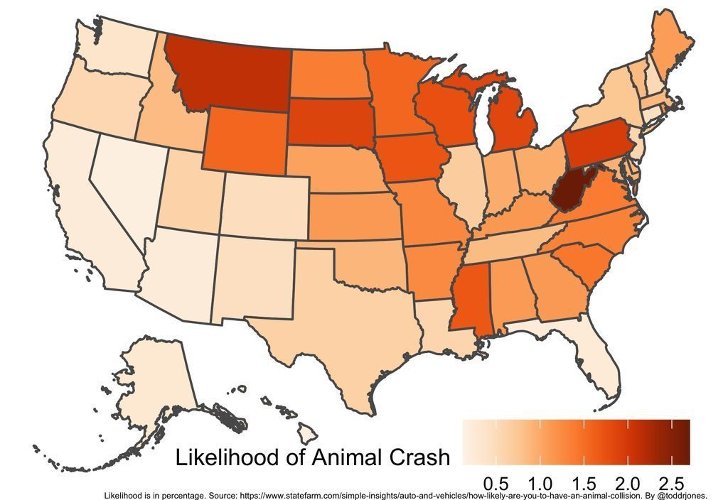16) States where you're most likely to run into a wild animal with your car: