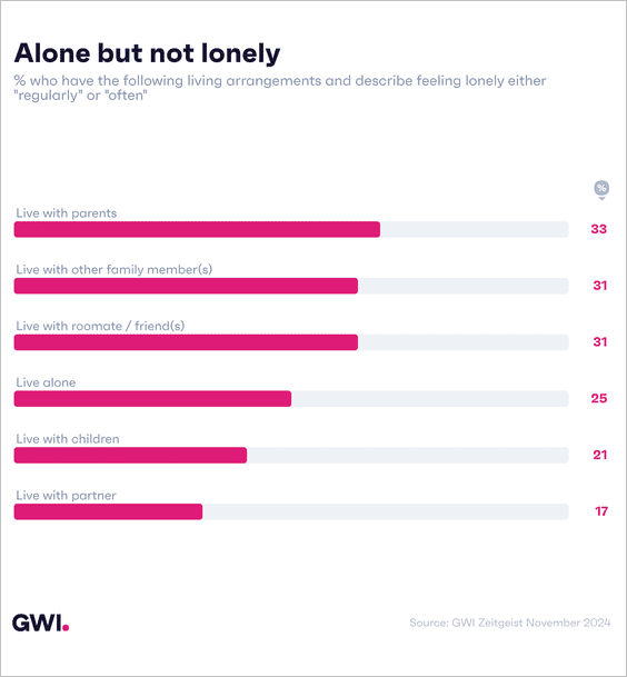 2) In this look at feelings of loneliness across different living arrangements, young people who live alone are less lonely than people who live with their parents: