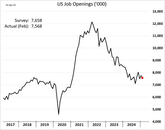 13) Job openings edged lower in February: