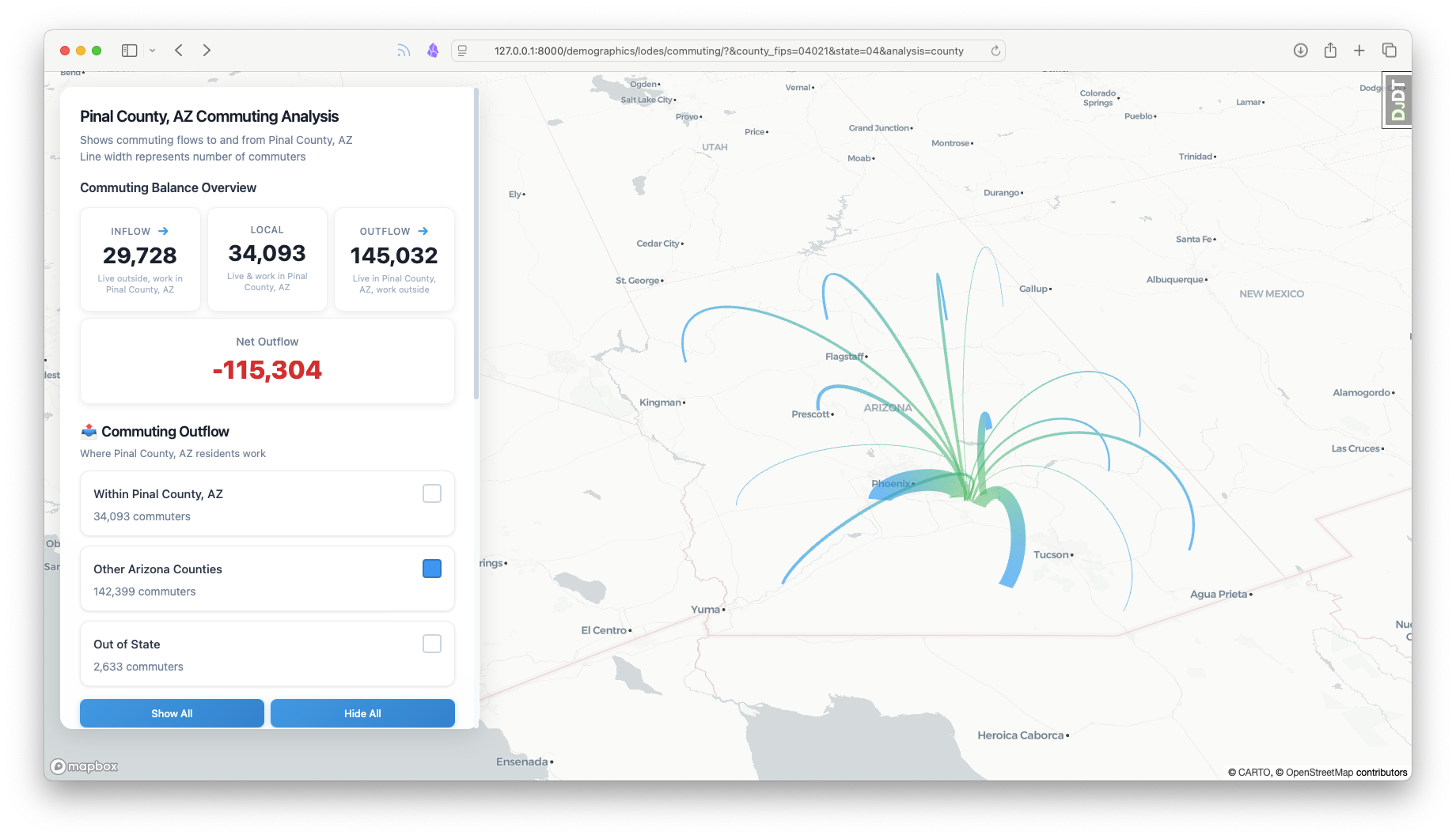 1) I've been working on building out a LODES data visualizer (where people work, where they live, and the connections between the two locations) for Sitehunt.