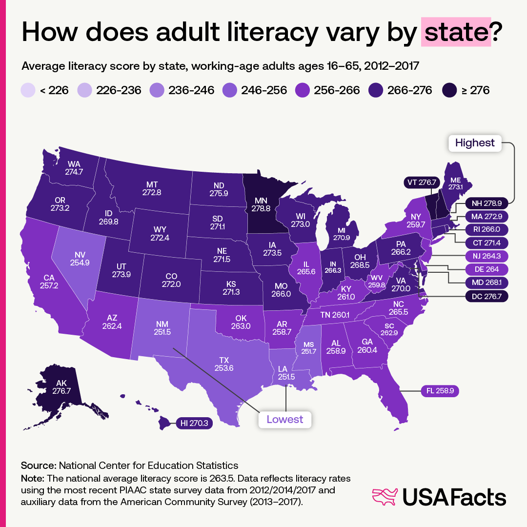 9) How does adult literacy vary by state?