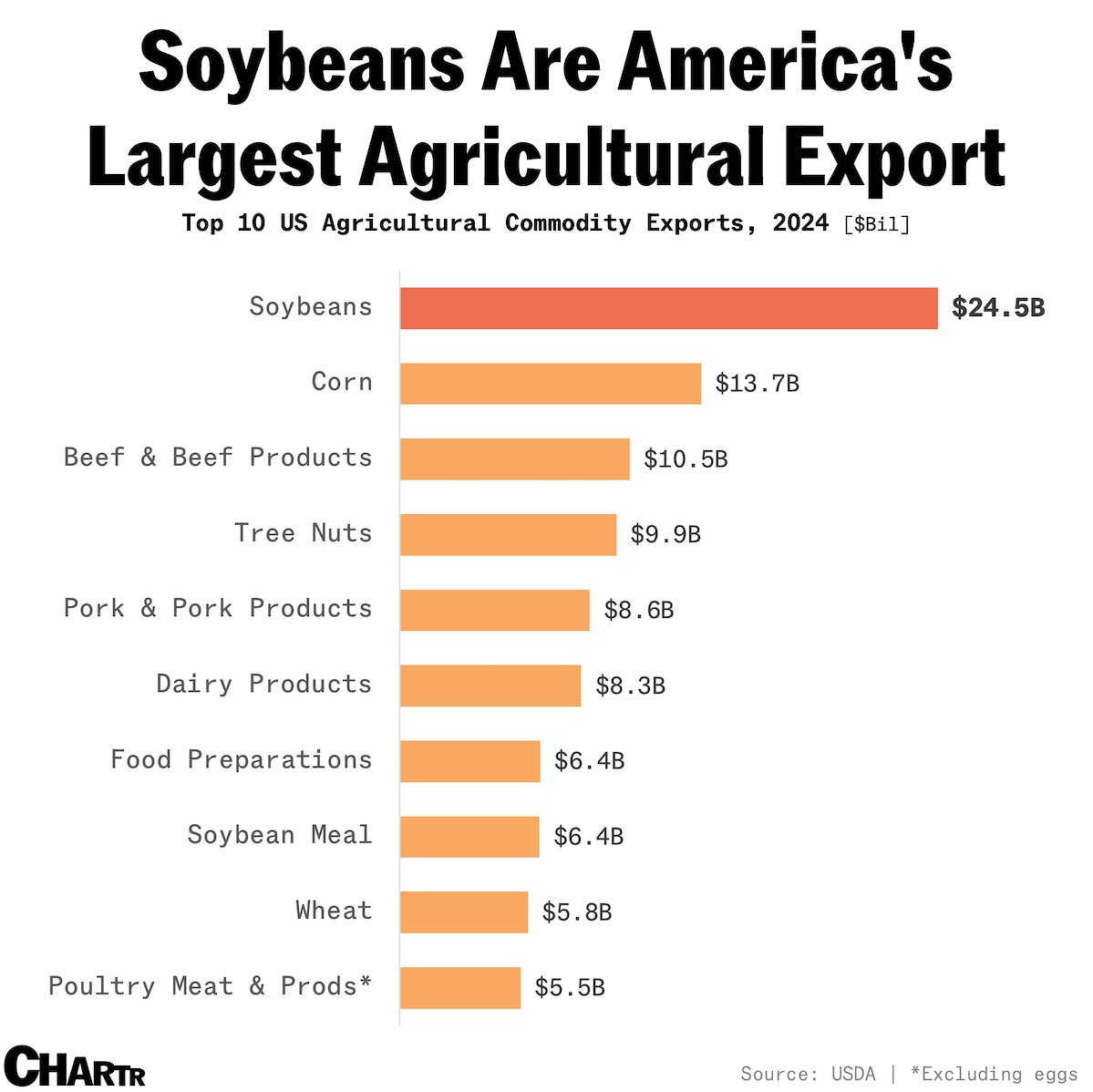 15) Soybeans are the US's largest agricultural export, worth $24.5 billion last year.