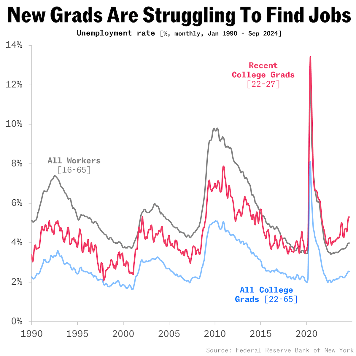10) The college premium isn't what it used to be, folks. Fresh grads hitting 5.3% unemployment (vs 2.5% for all college grads) isn't just a blip - it's breaking a multi-decade pattern. Young talent usually weathers downturns better than the broader workforce. Not anymore. The "just get a degree" story needs an update.