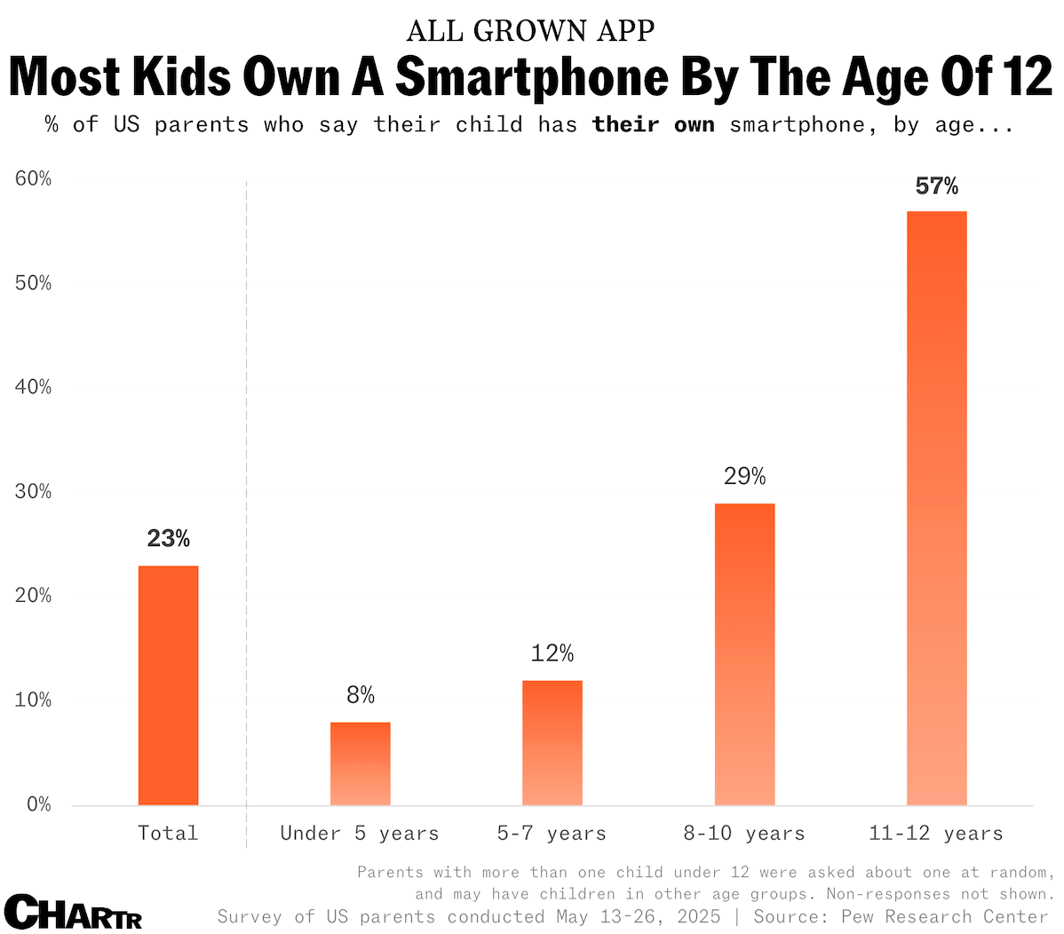 7) The Pew Research Center published a survey assessing how parents in the US with children under 12 manage their kids' screen time, which revealed that 61% of respondents reported that their child ever uses or interacts with smartphones -- including 38% of those with children under 2 years old.