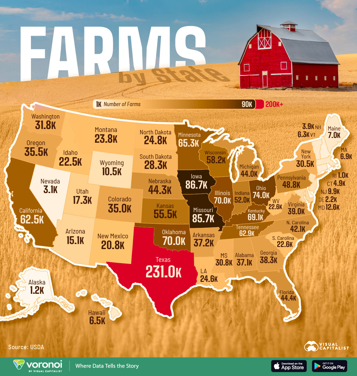 20) Mapped: The number of farms in each U.S. state.