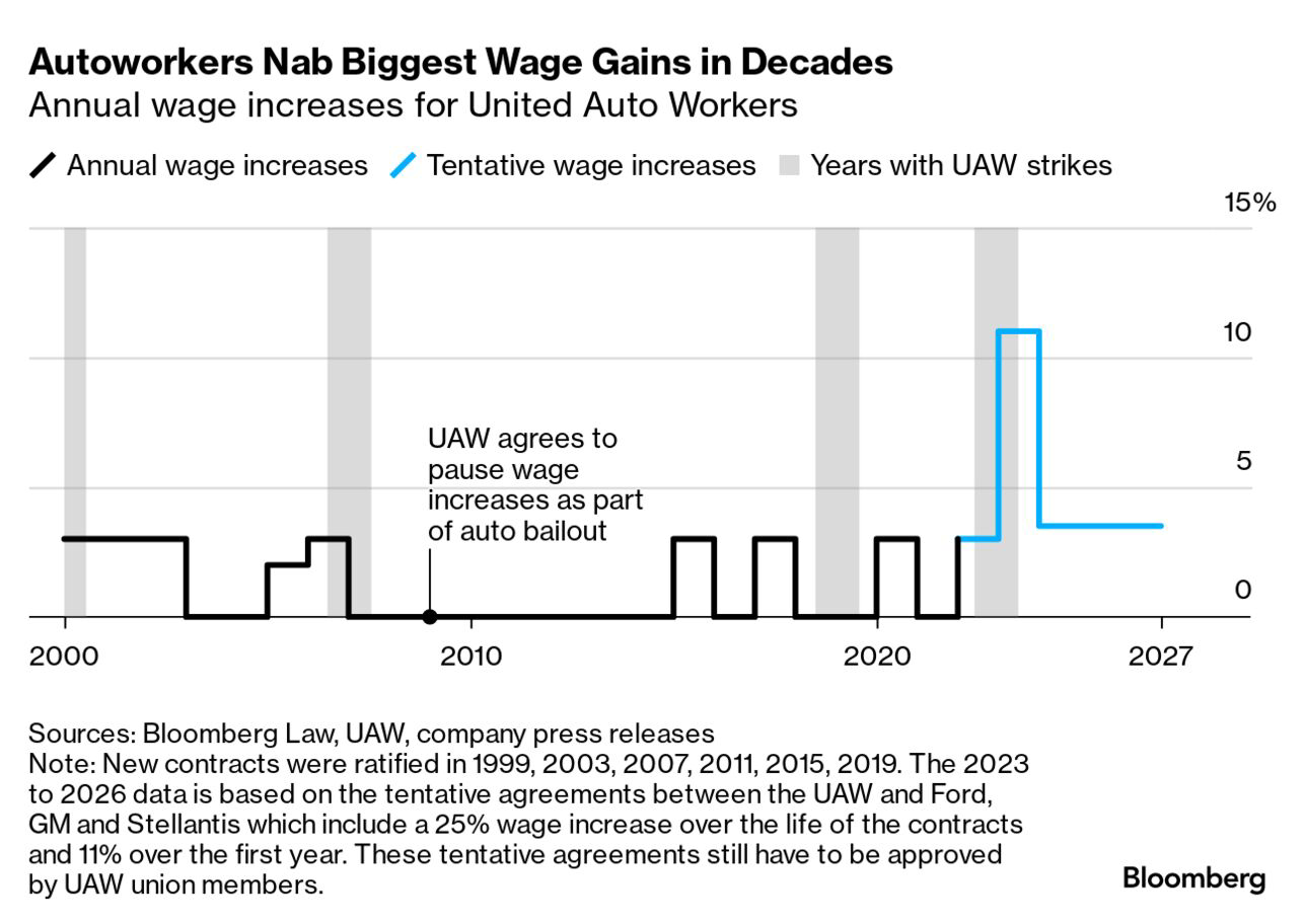 3) Workers in the US are getting record-breaking wage hikes this year thanks to strategic strikes and stunning contract wins. The result is a boost in middle-income wages: