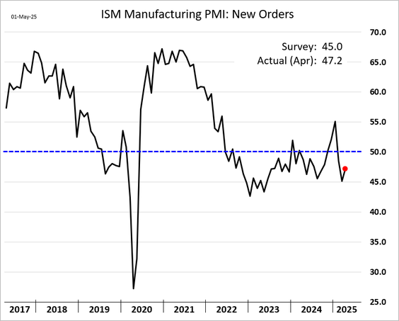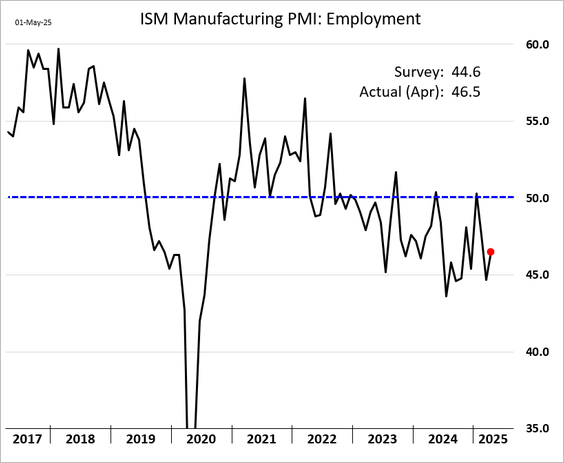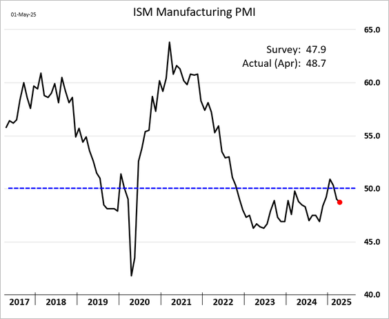 11) The ISM Manufacturing PMI indicated a contraction in April, though it was less severe than expected:
