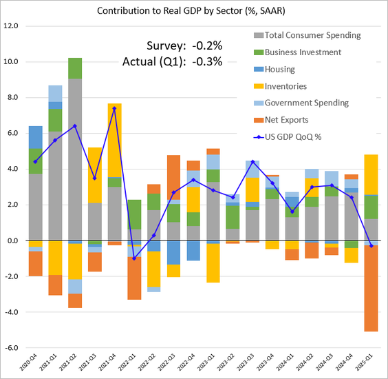 6) The US GDP contracted in the first quarter, driven by a sharp surge in imports ahead of impending tariffs. (Imports subtract from the GDP):