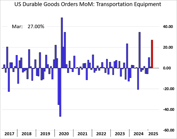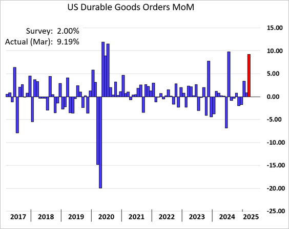 9) Durable goods orders surged in March: