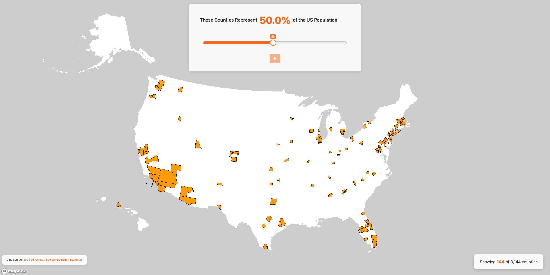 30) Half the country lives in 144 counties: National trends are really a handful of mega-regions, which matters for labor markets, site selection, and how you define your peer set. Explore: population concentration map.
