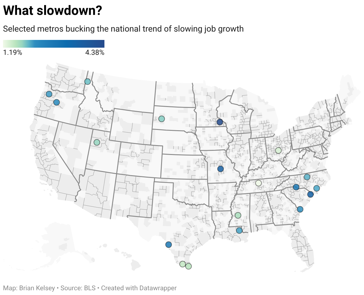 20) “What slowdown?” metro edition: National averages hide local outliers, and those outliers are where deals and talent tend to stack. Read: What slowdown?.