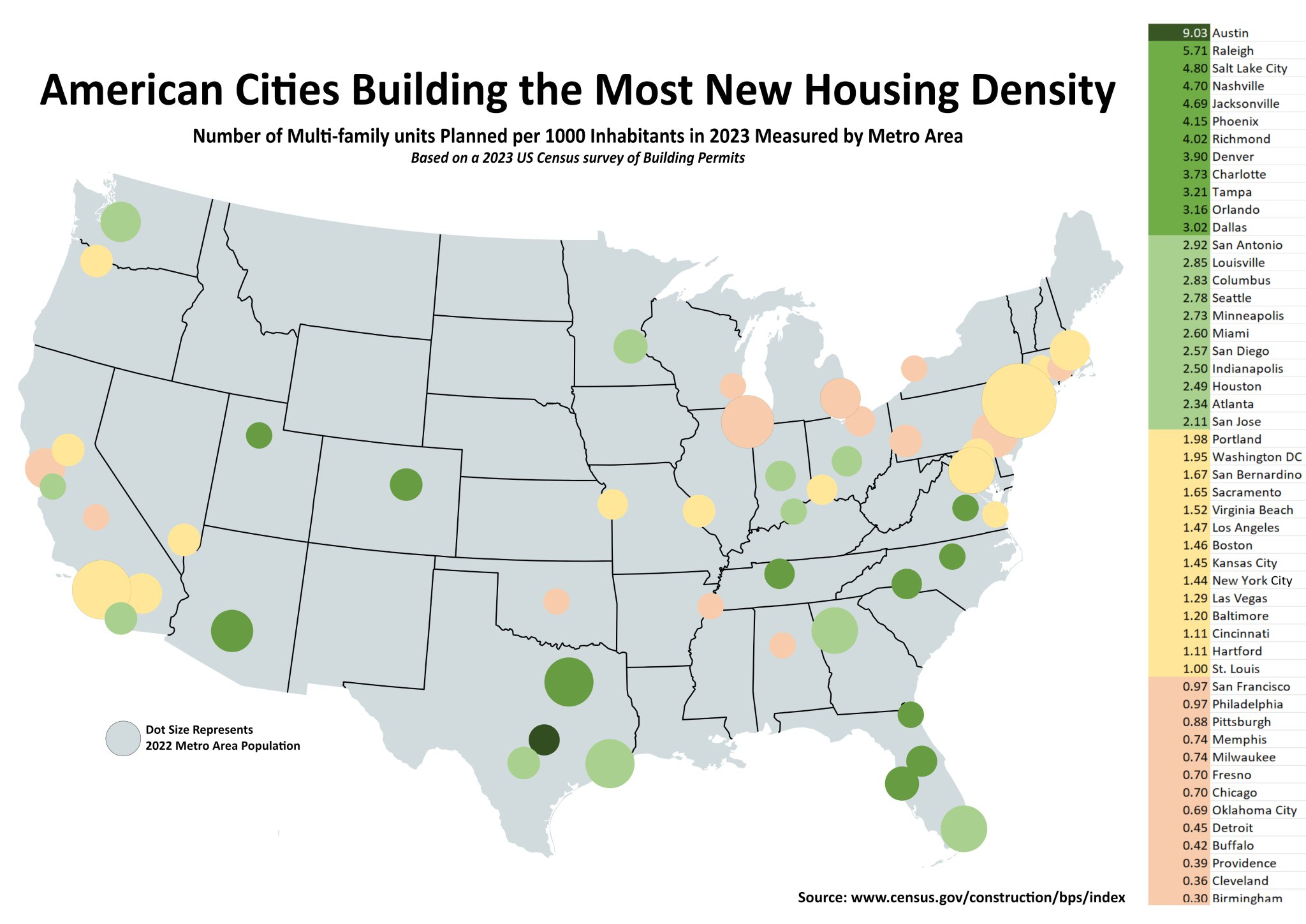 7) American cities building the most new housing density, based on the number of multi-family units planned per 1000 inhabitants in 2023 measured by metro area. Notice the bulk are in the south.