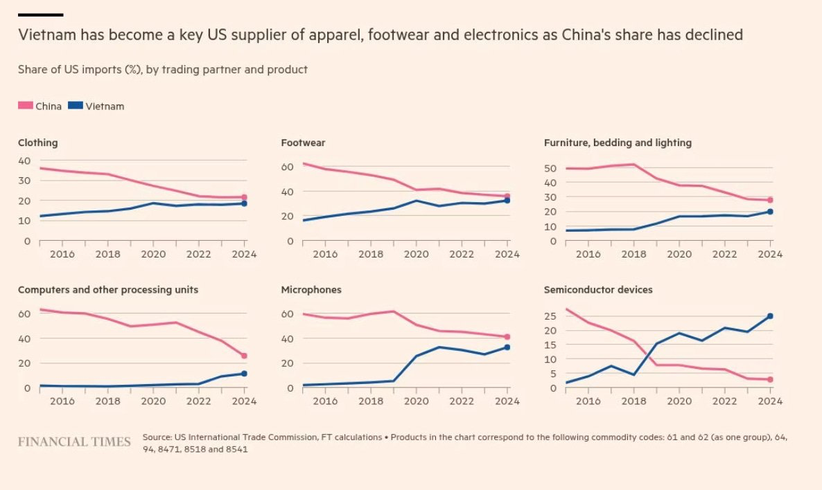 10) Vietnam has become a key US supplier of apparel, footwear and electronics as China's share has declined: