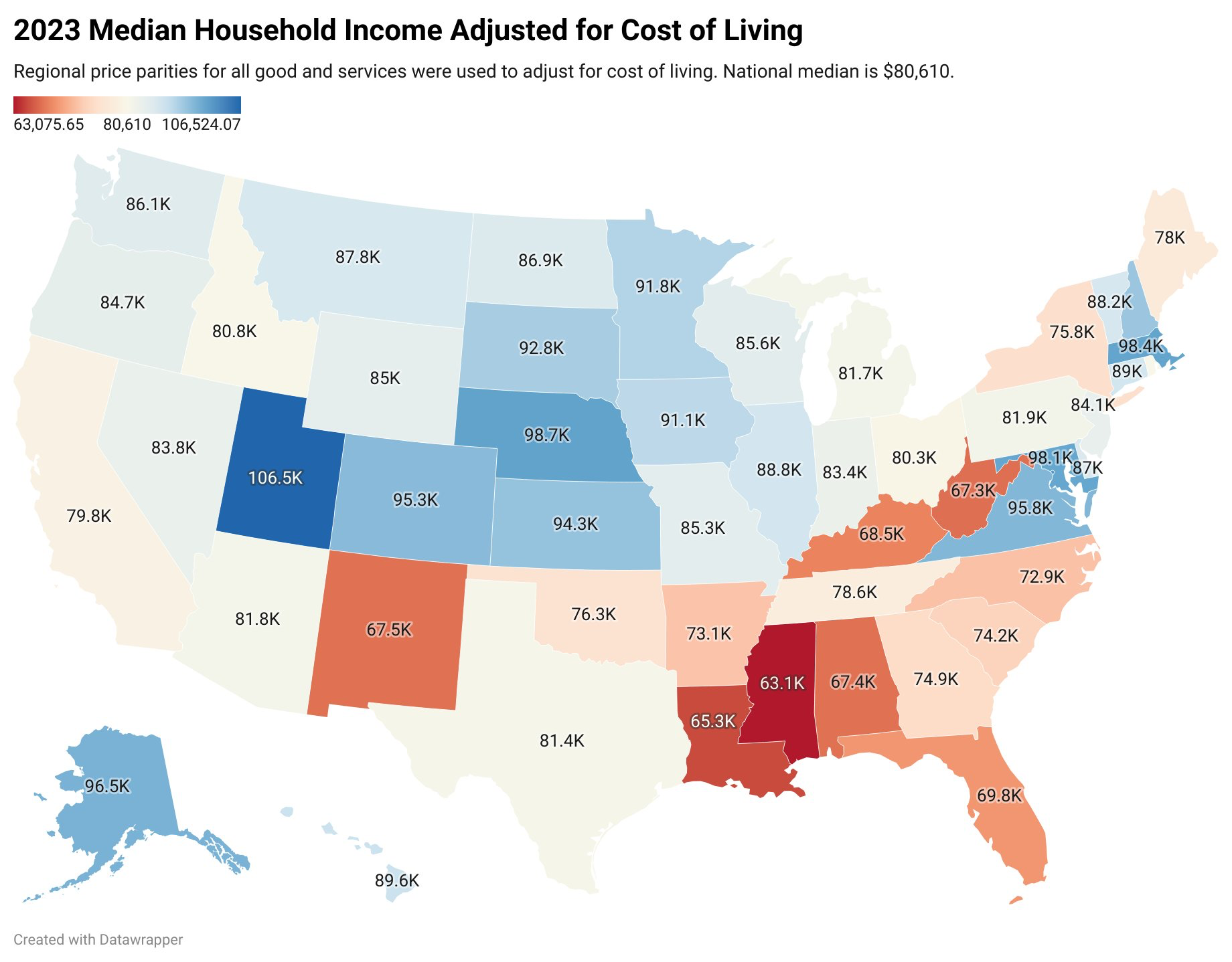 8) This map shows the 2023 median household income for each state in the U.S., adjusted for the cost of living. The adjustments take into account how much things like housing, food, and services cost in each state. The national median income is $80,610, but how far your money goes depends on where you live: