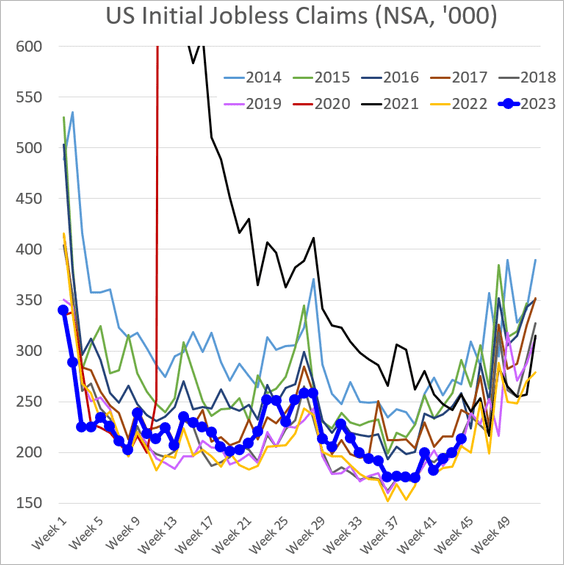 3) Good: Initial jobless claims are holding just above multi-year lows: