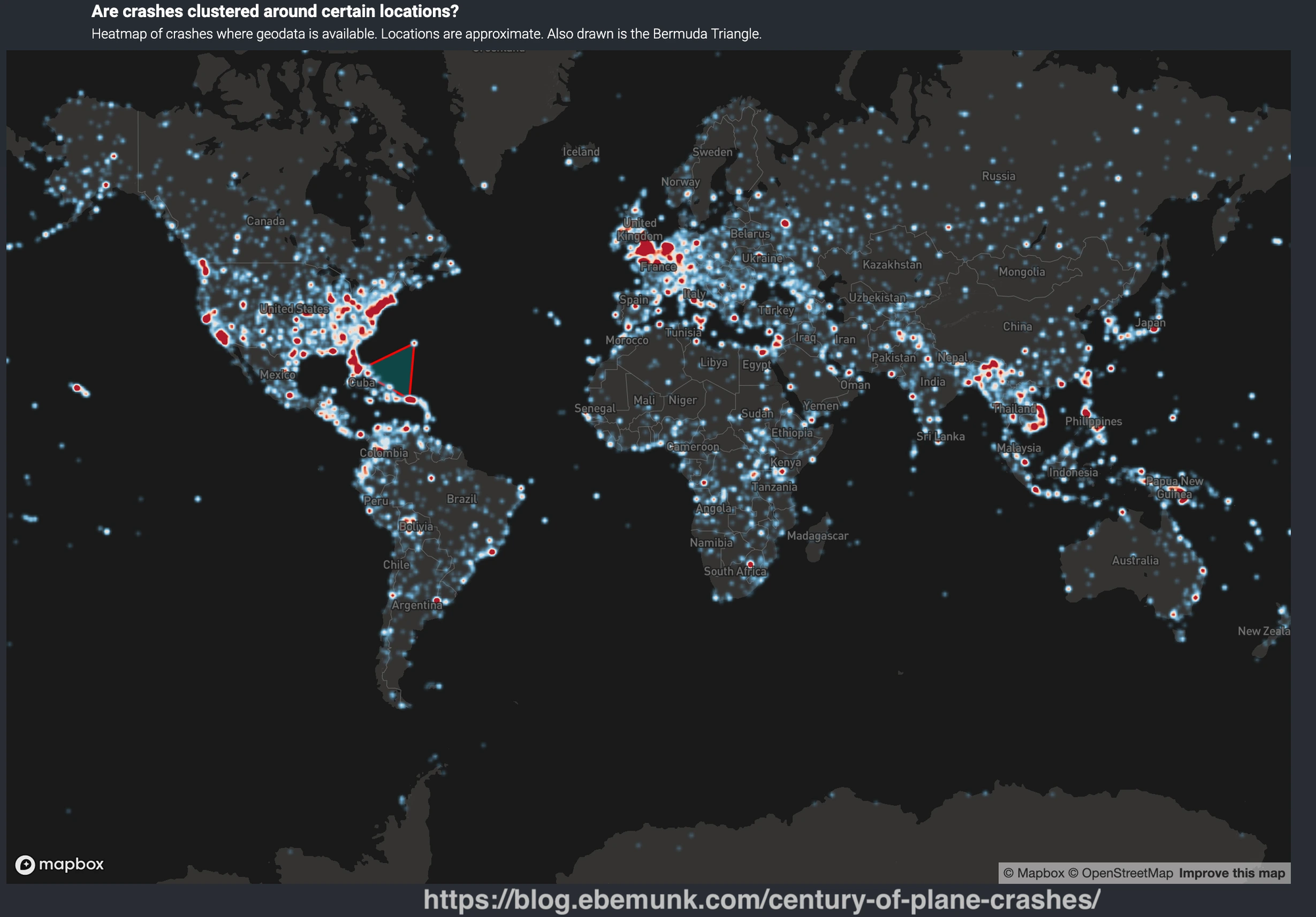 The location of all airplane crashes in the last 100 years with the Bermuda Triangle outlined: