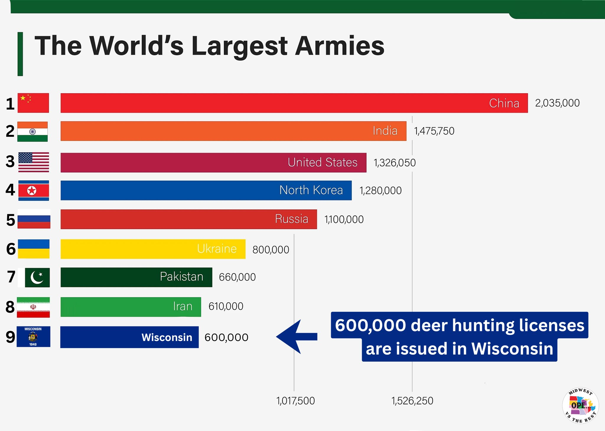 13) Wisconsin becomes the 9th largest army in the world during deer hunting season: