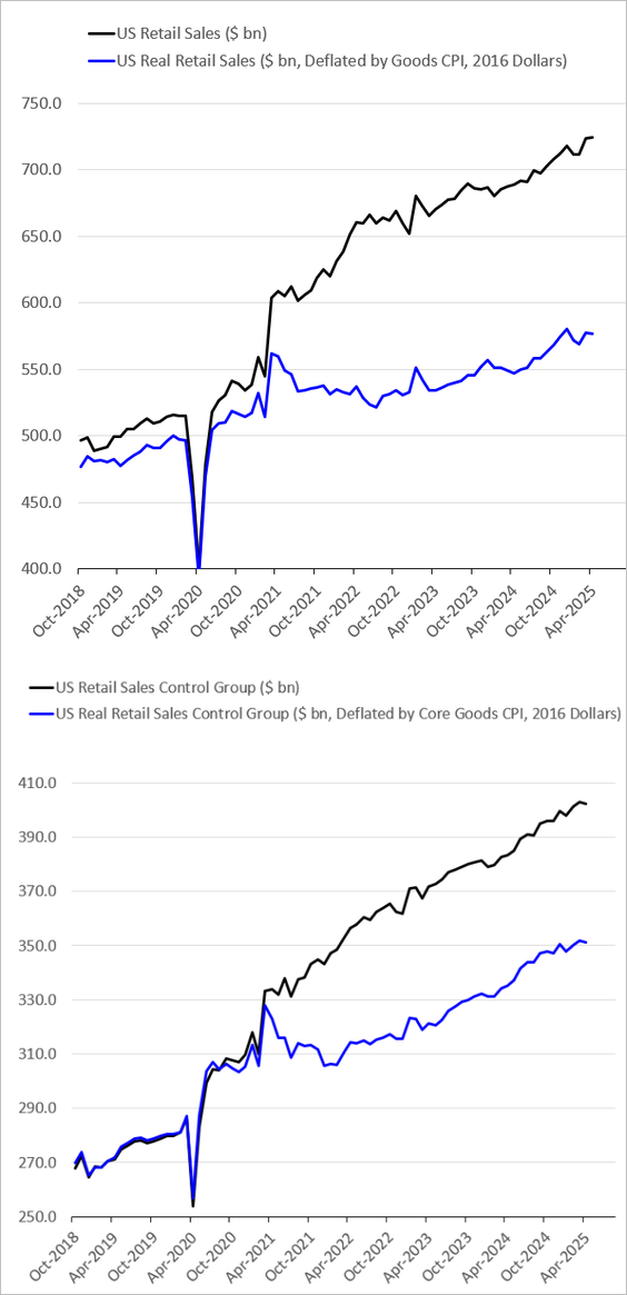17) Here are the trends in nominal and real retail sales (levels):