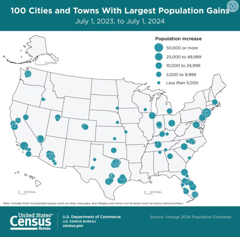 6) The 2024 population estimates released this week by U.S. Census Bureau. Here are the top 10 cities above 500,000 or more residents ranked by percentage growth: