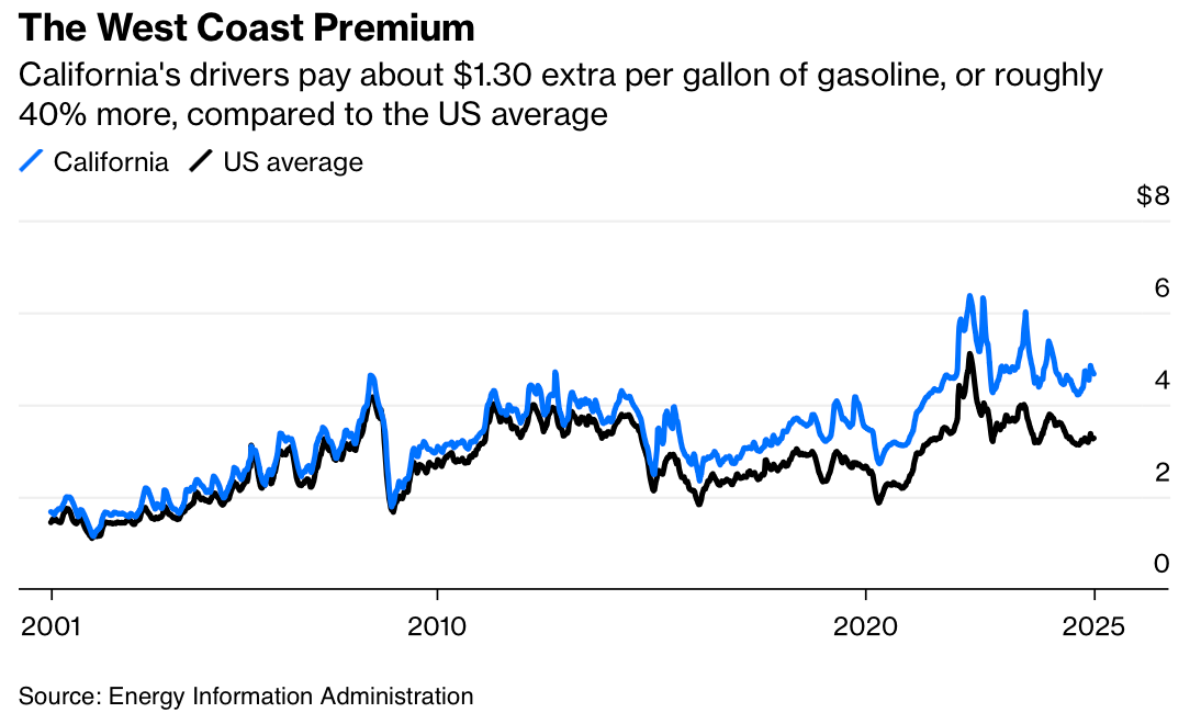 18) Gasoline prices in California vs. the US average: