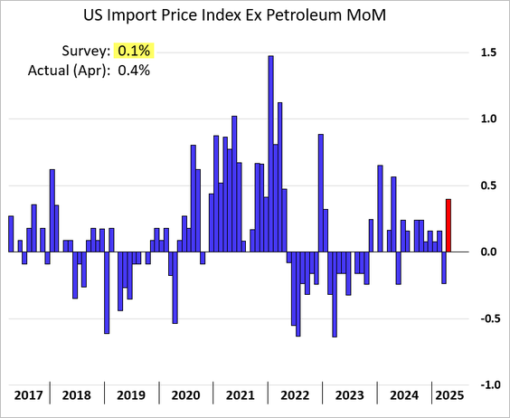 22) US import prices jumped more than expected in April. This index reflects the prices of goods as they arrive at the US border before tariffs, duties, or taxes are applied: