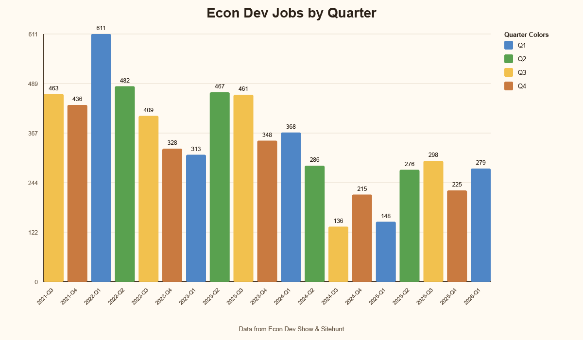 After a steady slowdown through 2024, the number of open economic development jobs has been climbing back up through 2025 and into 2026. Hiring was extremely strong a few years ago, then gradually cooled as organizations worked through leadership transitions, political changes, restructuring, and shifts in federal grant funding. For a while it felt like a lot of communities were hitting pause while they figured out budgets, priorities, and who was going to be in charge.