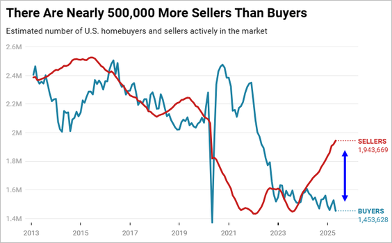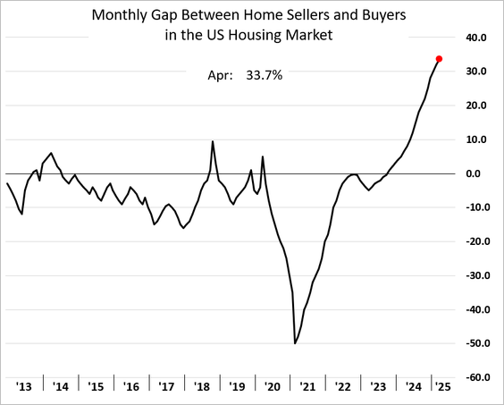 24) According to data compiled by Redfin, the gap between home sellers and buyers in the US housing market hit a record 33.7% in April, with nearly 500,000 more sellers than buyers. With inventory piling up and buyer demand softening, market dynamics have shifted decisively in favor of buyers: