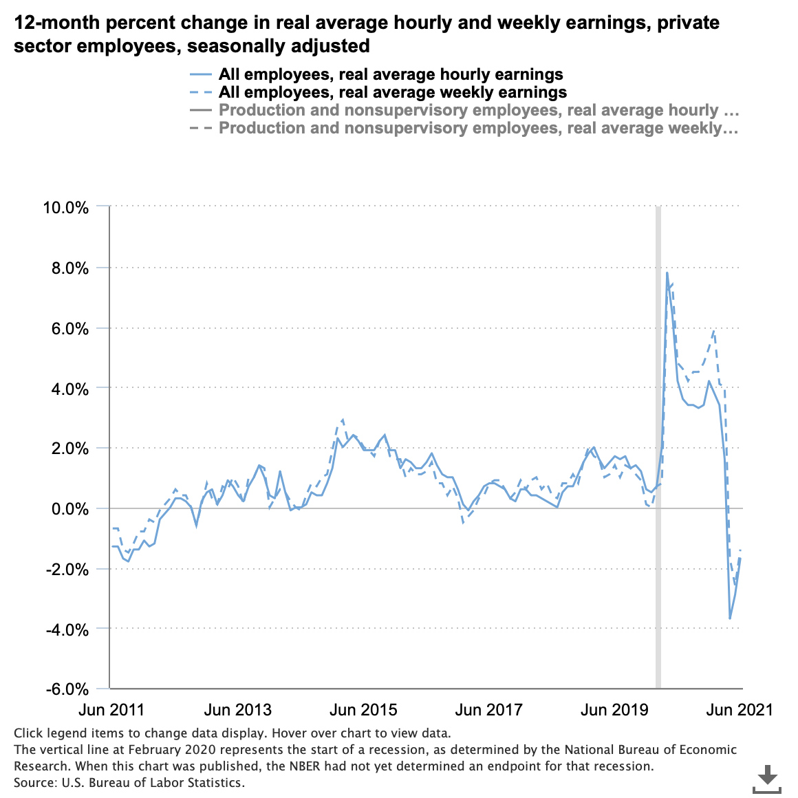 9) Real average hourly earnings are down 1.7 percent over the 12 months ending June 2021: