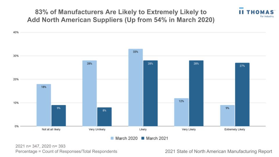According to the latest 2021 Thomas State of North American Manufacturing Report, 83% of manufacturers are planning to add North American suppliers to their supply chains within a year, a significant increase from 54% in March 2020.