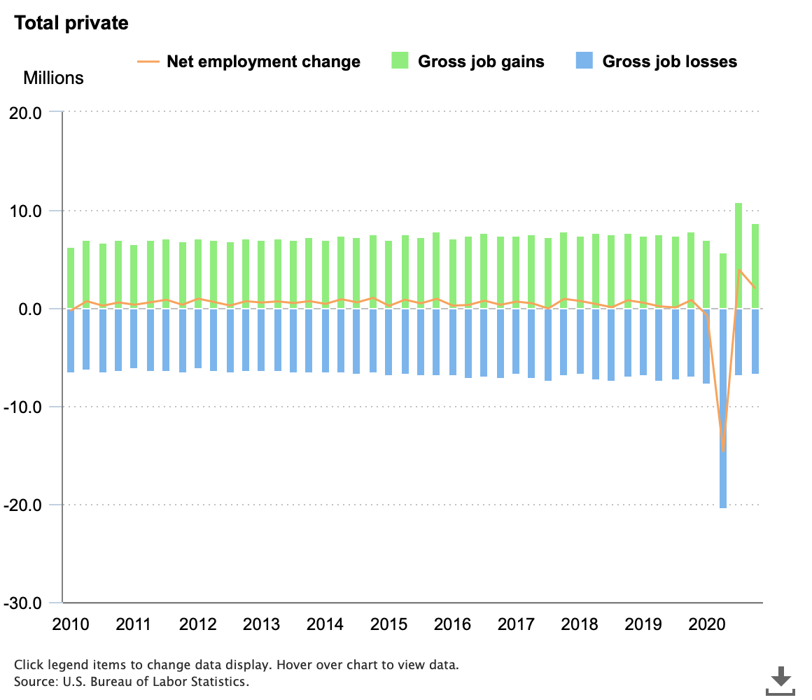 Gross job gains exceeded gross job losses in all 13 major industries in the fourth quarter of 2020: