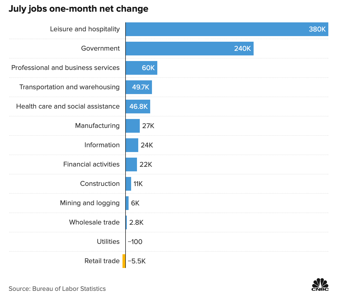 Here’s where the jobs are — in one chart: The headline numbers from the July 2021 jobs report showed the U.S. economy added 943,000 jobs last month and that the unemployment rate fell sharply from 5.9% to 5.4%.