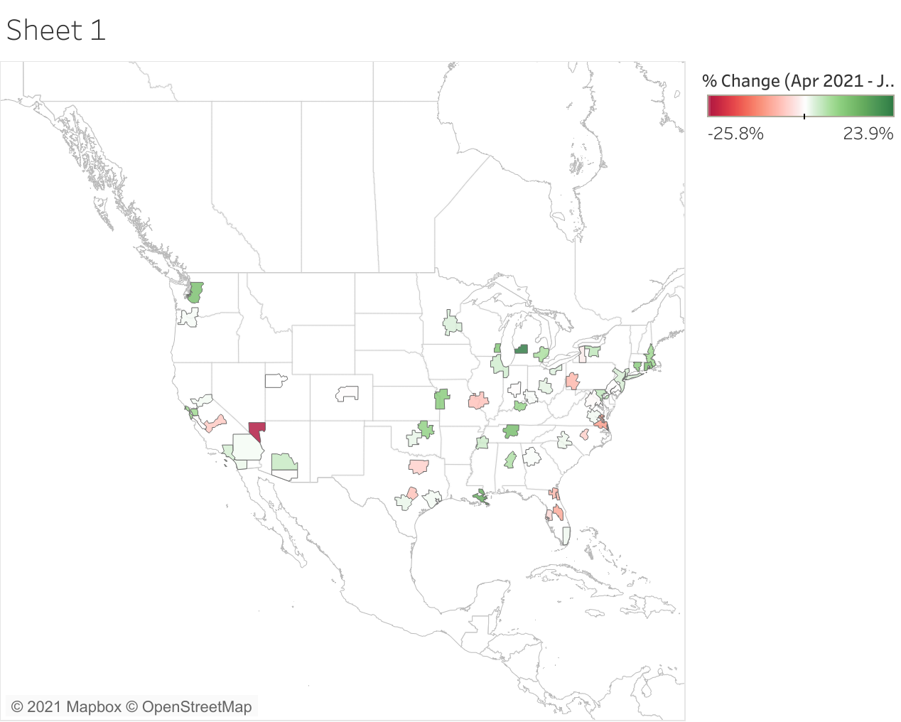 COVID-19’s impact on the demand for manufacturing and production workers: The following map represents all metro areas with a population over 1 million shaded by percent change in unique job postings for production occupations over the last 90 days.