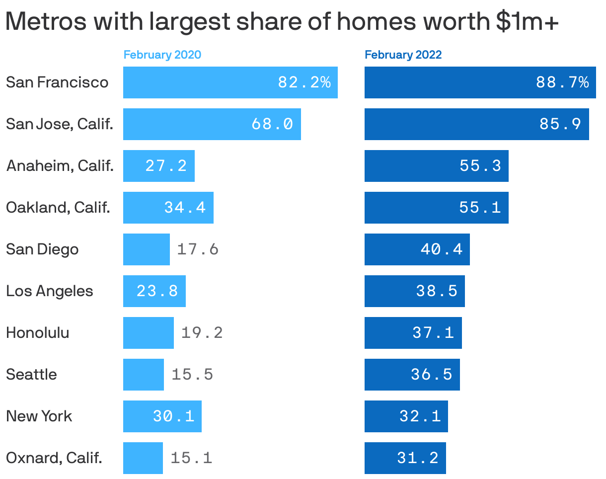 Metros with largest share of homes worth $1m+: The number of U.S. homes worth more than $1 million nearly doubled since before the pandemic, to 8.2% in February from 4.8% in February of 2020.