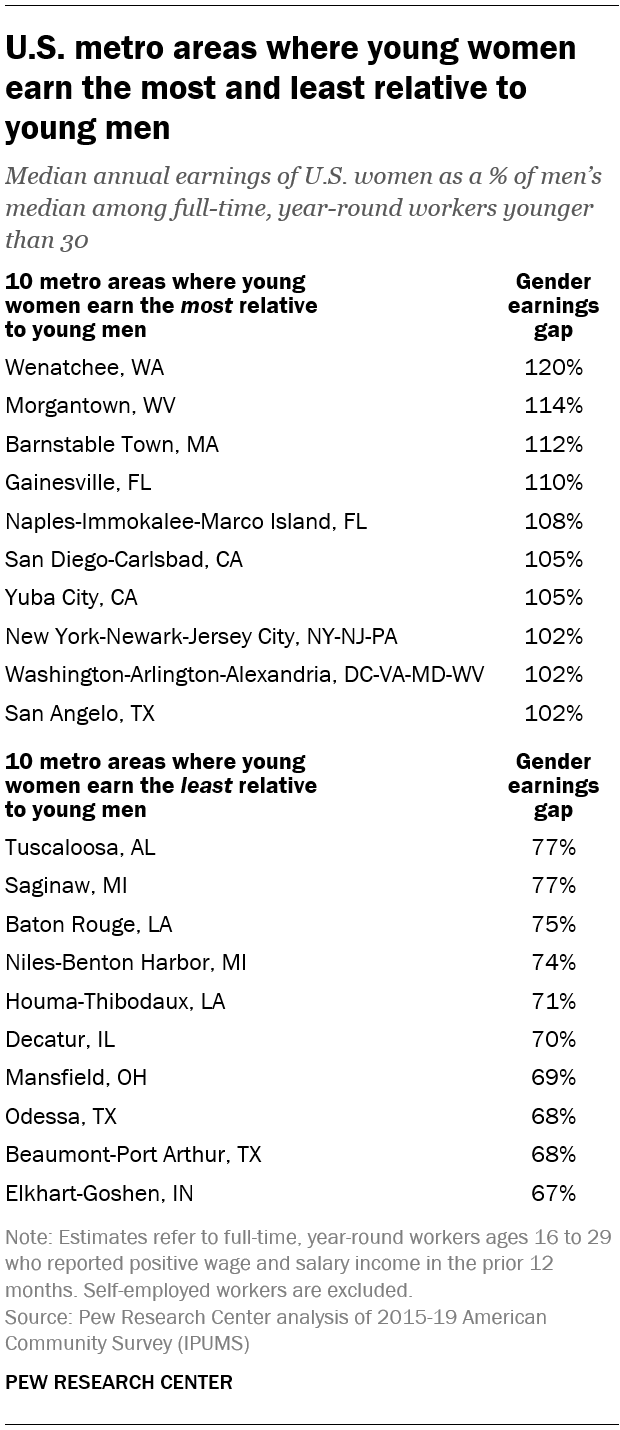 Young women are out-earning young men in several US cities: In 22 of 250 U.S. metropolitan areas, women under the age of 30 earn the same amount as or more than their male counterparts, according to a new Pew Research Center analysis of Census Bureau data.