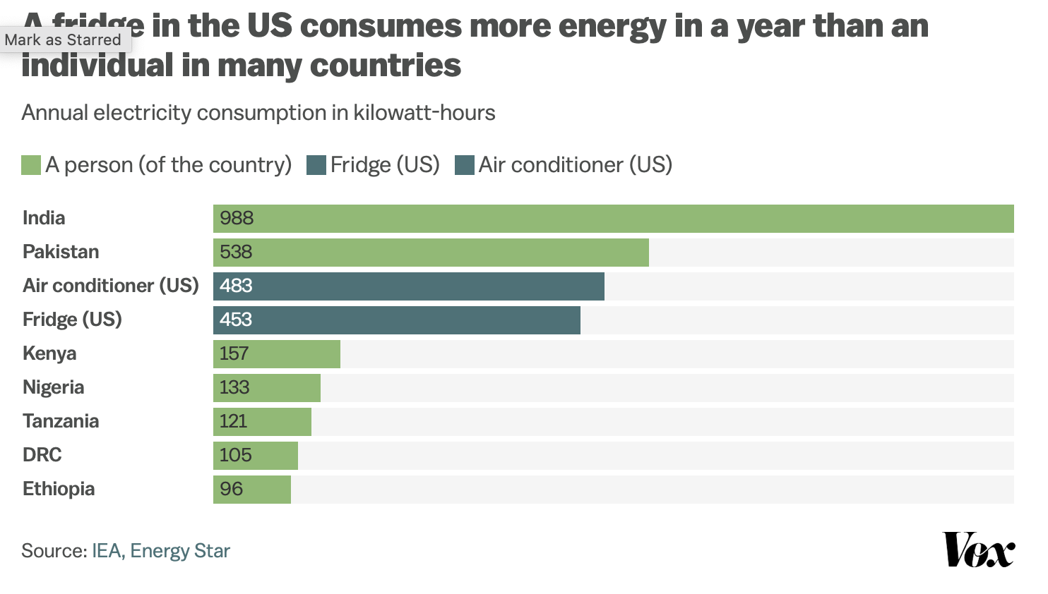 The average fridge in the US consumes more electricity in a year than an average person in dozens of countries.