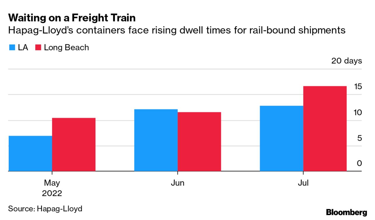 At the Ports of Los Angeles and Long Beach, there's another transportation bottleneck. This time, it's not in the water, it's on the rails: The dwell time for intermodal containers through Long Beach are waiting an average of 16.6 days, up from 10.4 days in May. The delays through LA have doubled to 12.8 days over that same two-month span.