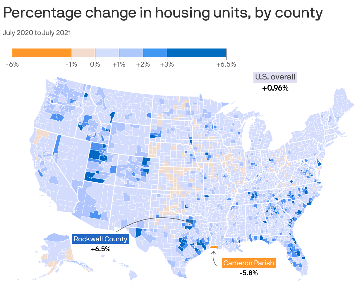 Where US housing is growing: In census data out this month, you can see a massive boom in suburban homebuilding, especially in Texas. Click here for an interactive version.