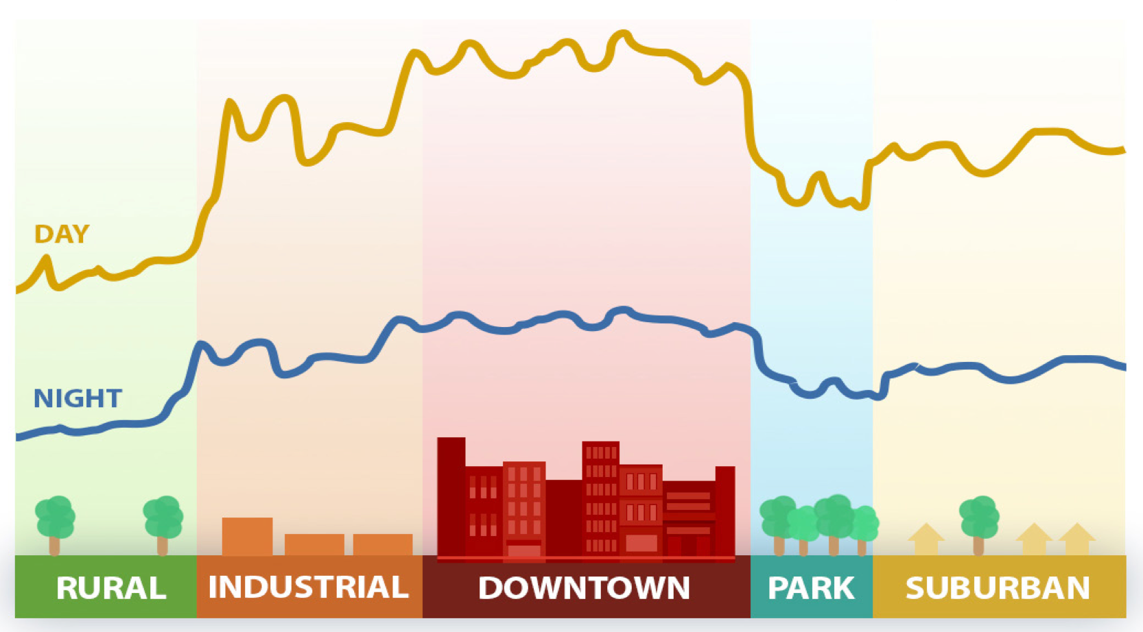 Urban heat islands are metropolitan places that are hotter than their outlying areas, with the impacts felt most during summer months. About 85% of the U.S. population lives in metropolitan areas. Paved roads, parking lots, and buildings absorb and retain heat during the day and radiate that heat back into the surrounding air. Neighborhoods in a highly-developed city can experience mid-afternoon temperatures that are 15°F to 20°F hotter than nearby tree-lined communities or rural areas with fewer people and buildings.